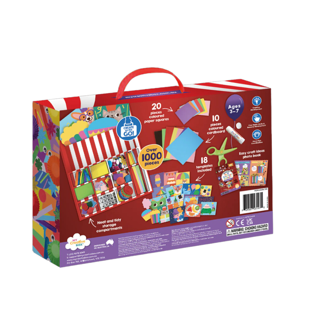 Inside your kit, you'll find a craft ideas book brimming with inspiration, alongside over 1000 pieces, including glue, airport-approved scissors, Australian illustrated templates, a convenient art board, and essential art supplies. Everything you need for hours of sensory collage crafting, neatly packed in a sturdy organised portable box.